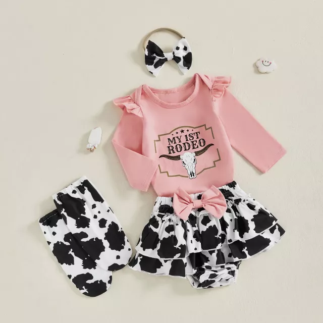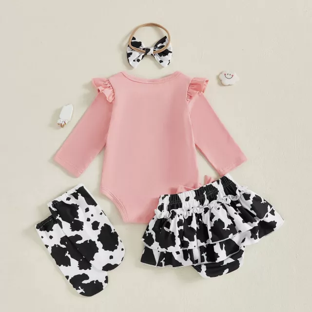 The romper features a classic round neckline, long sleeves, and fun letter print that adds a playful touch. The cow print skort has a layered hem and stretchy elastic waistband, giving your baby both style and comfort. The matching headband and socks complete the outfit, making it an all-in-one solution for parents who want their little one to look effortlessly adorable.