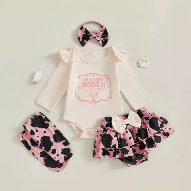 Dress your baby girl in the sweetest western-inspired outfit that’s as stylish as it is comfortable. This 4-piece set includes a letter print romper, a playful cow print layered skort, a matching headband, and a pair of cute socks—everything you need to create a picture-perfect look. With soft, breathable fabrics and thoughtful details, this outfit is designed for both everyday wear and special occasions.