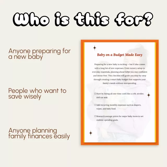 This digital checklist is perfect for expecting parents, new moms and dads, or caregivers who want to feel prepared without the financial overwhelm. It’s ideal for those who love structure and simplicity — and who value practical tools to stretch every dollar further.