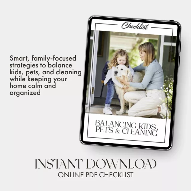 Transform your household chaos into calm today. Download the Balancing Kids, Pets & Cleaning checklist and discover the best way to balance kids, pets and cleaning—so you can spend more time enjoying your family and less time stressing about the mess. Get instant access now and start your journey toward a cleaner, more balanced home life!