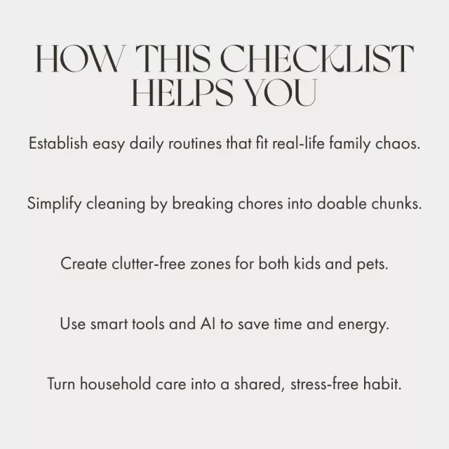 This digital checklist is perfect for parents, pet lovers, and multitaskers who want a clean, happy home without constant stress. It’s for those who crave structure but need flexibility—people who want to keep their house tidy and functional, even with little ones and furry friends underfoot.