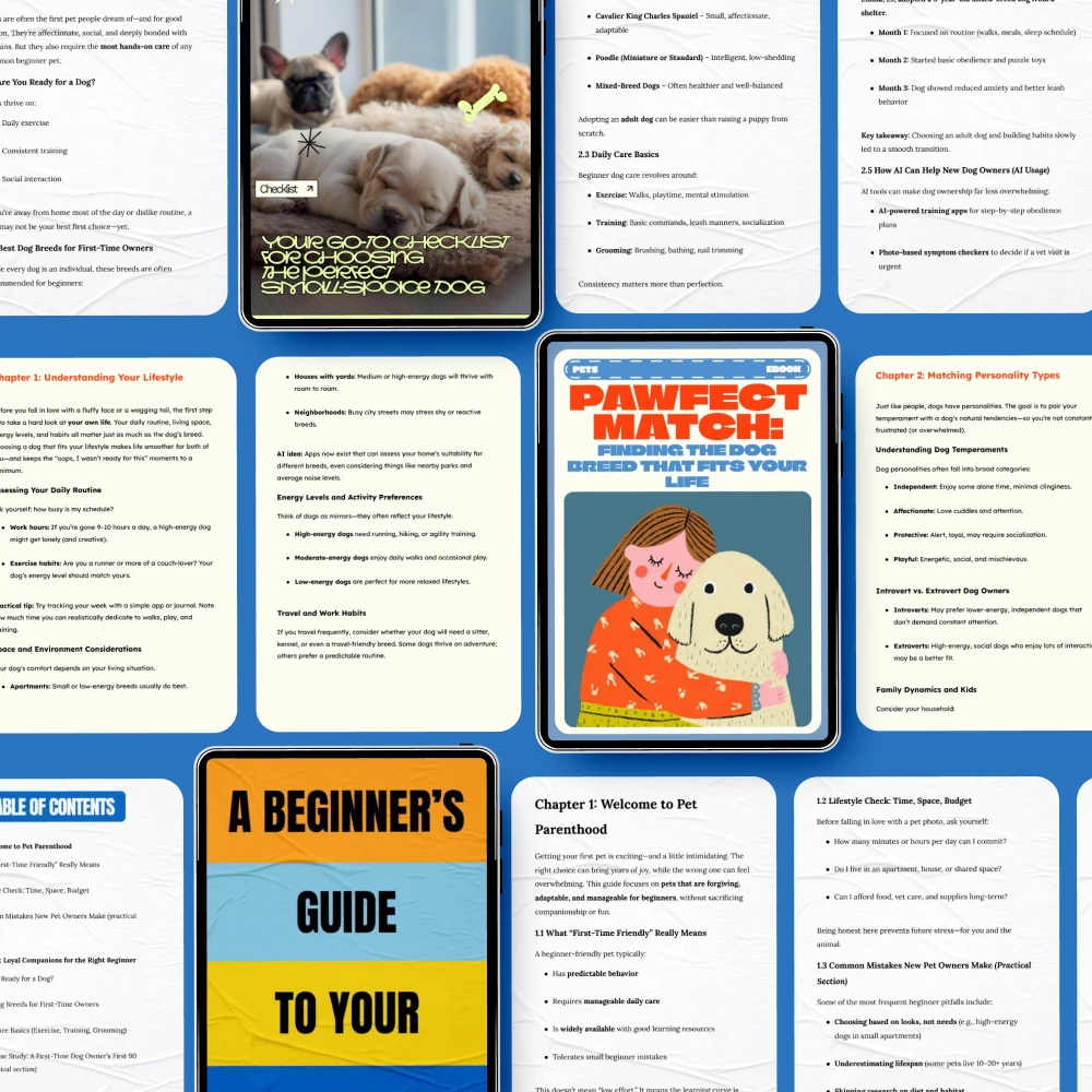 Unlike other generic resources on dog ownership, our bundle focuses specifically on the planning process for those asking, “Should I get a dog?” and how to choose the right dog for small living spaces. It’s a one-stop solution that covers all the key aspects of pet ownership, from breed selection to first-time pet care. You won’t need to search for multiple resources—we’ve combined everything you need into one convenient download.