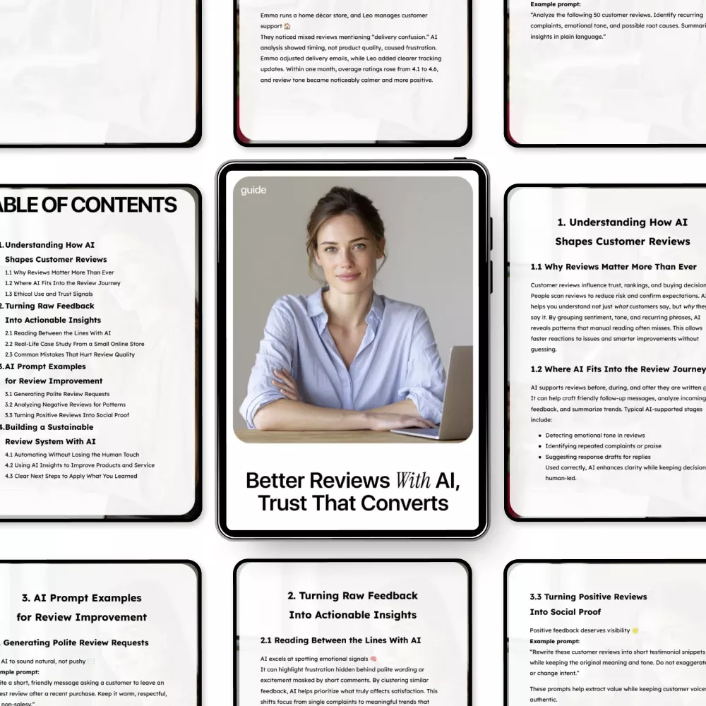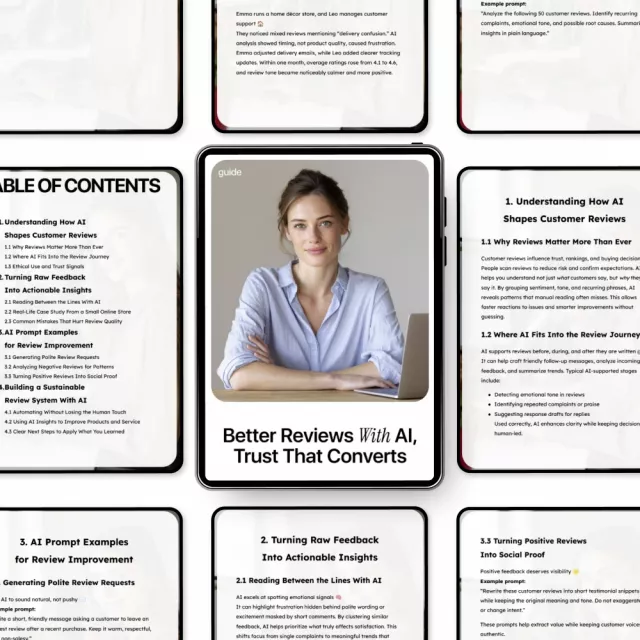 This guide is built for store owners, digital product sellers, service providers, and marketers who want better reviews without spammy tactics. Instead of generic advice, it gives you realistic workflows and prompt examples you can actually use. You will learn how to spot patterns in negative reviews, amplify positive ones, and improve products and service using AI-driven insights.