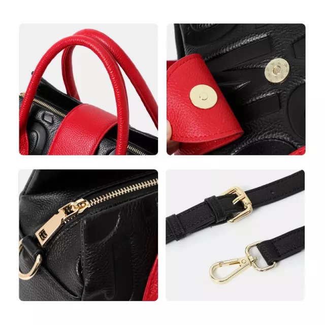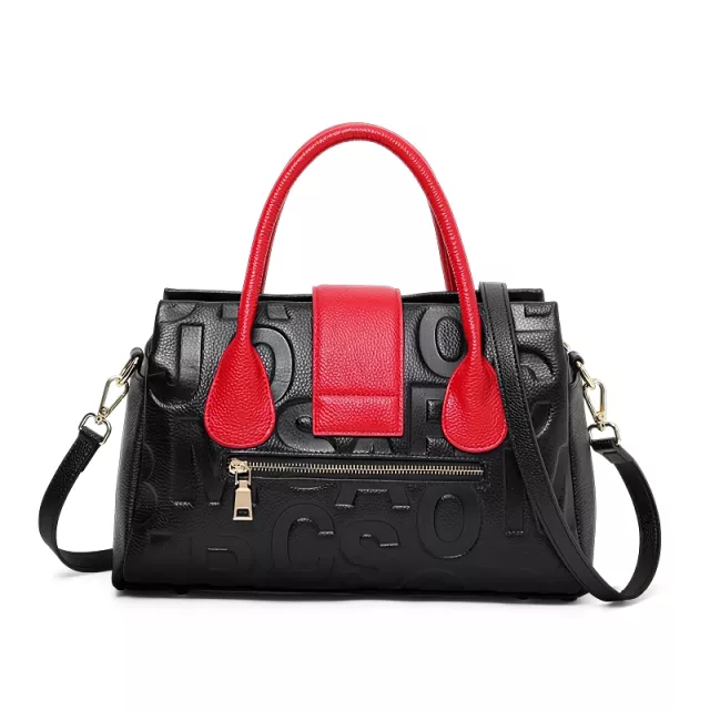 Black and Red Genuine Leather Tote – Alphabet Embossed Color Block Design