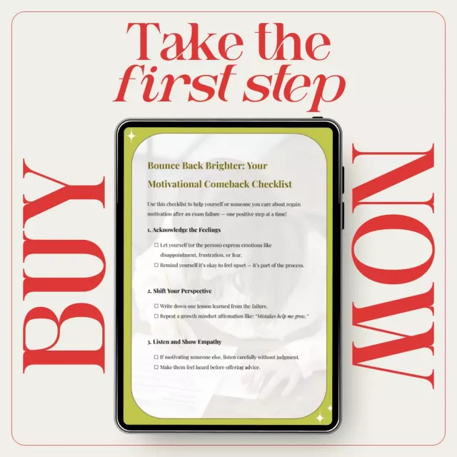 Failing an exam can feel overwhelming, discouraging, and deeply personal. Bounce Back Brighter: Your Motivational Comeback Checklist is a supportive, easy-to-use digital checklist created to help turn that setback into a meaningful comeback. Whether you’re working through your own disappointment or learning how to motivate someone who failed in exam, this checklist guides you step by step toward renewed confidence, focus, and momentum—without pressure or overwhelm.