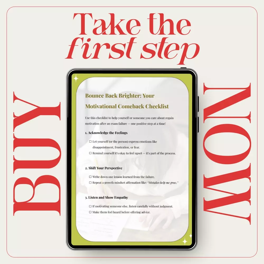 Exam failure doesn’t define potential—your response does. Bounce Back Brighter: Your Motivational Comeback Checklist is your ready-to-use guide for turning disappointment into direction. Download instantly and take the first step toward a calmer, more confident, and motivated comeback today.