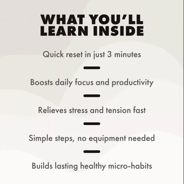 • Chapter 2: The 3-Minute Breath & Stretch Combo – Step-by-step routine with grounding breath, upper body stretch, and full-body reset