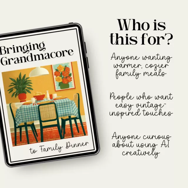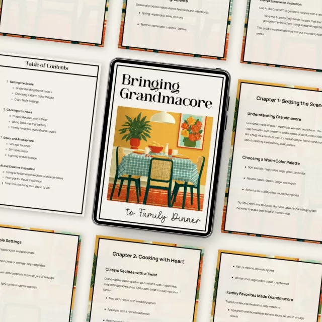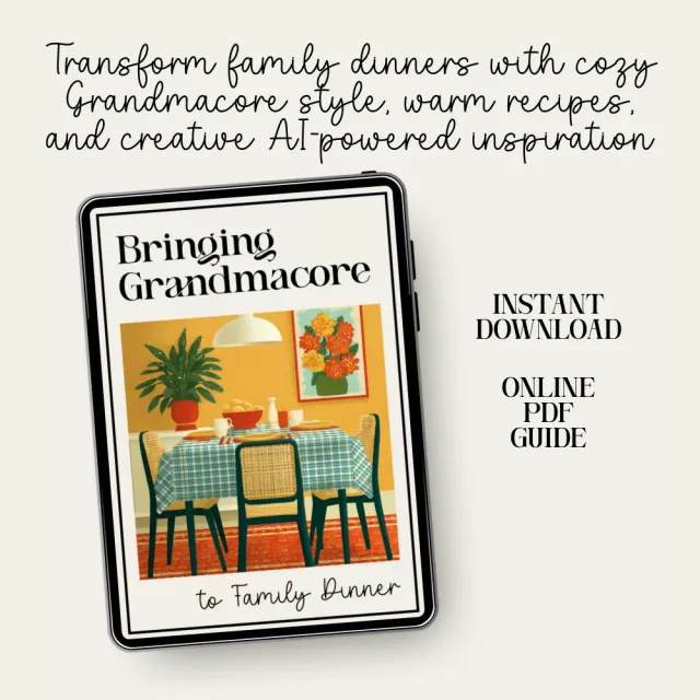 This resource blends traditional grandmacore styling with modern tools, giving you both heartfelt inspiration and practical, step-by-step guidance. Unlike other aesthetic guides, this one shows you how to apply the aesthetic to real family dinners—recipes, decor, ambiance, and even AI-powered creativity—so you can make every meal feel comforting, magical, and meaningful.