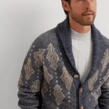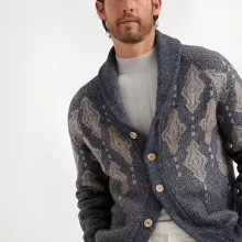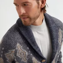 The shawl lapels give this cardigan a distinguished appearance, making it a standout piece that is both fashionable and functional. Its front closure, featuring contrasting buttons, adds an extra element of detail and sophistication. Designed with two convenient front slit pockets, this cardigan combines practicality with style, providing ample space for small essentials or simply a comfortable place to rest your hands. The ribbed cuffs and ribbed hem further enhance the garment’s shape and add a refined finish to the overall design, ensuring it fits comfortably without compromising on style. The regular fit ensures a flattering silhouette for all body types, making it easy to layer over shirts, blouses, or even t-shirts for various occasions.