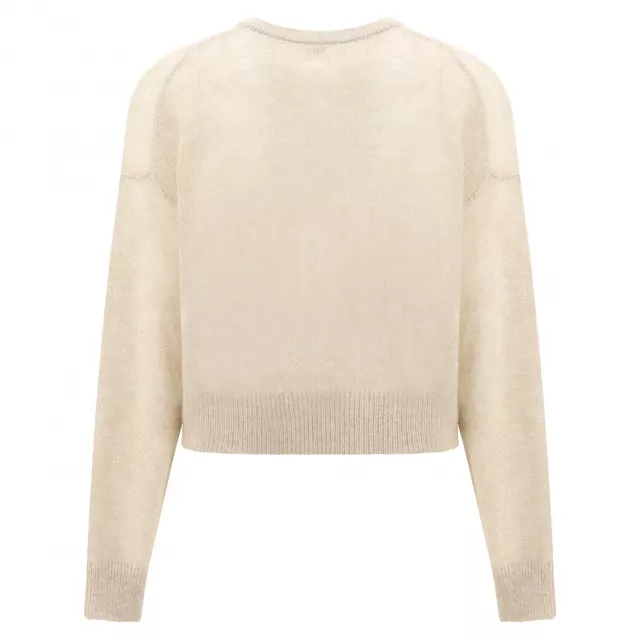 The sweater features a ribbed crew neck, ribbed hem, and cuffs, giving it a snug fit that enhances its refined look. Its semi-sheer design creates a sense of lightness, while the wide sleeves with dropped shoulders add a relaxed and modern touch to the silhouette. This combination of luxurious materials and thoughtful design makes it perfect for both casual and more polished looks, whether you’re out for a day in the city or attending a cozy evening gathering.