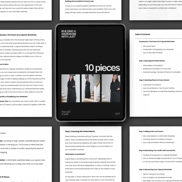 Unlike generic fashion guides, this resource focuses on a realistic, 10-piece system with practical examples, seasonal strategies, and modern tools to help you track and evolve your looks over time.