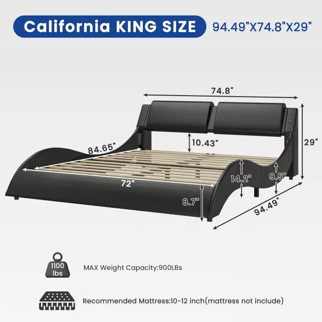 Transform your bedroom into a luxurious retreat with this California King Platform Bed Frame featuring a sleek faux leather finish, integrated RGB LED lighting, and built-in USB & Type-C charging ports. Designed with a striking wave-like silhouette and ambient under-bed lighting, this bed is not just a place to sleep—it’s a lifestyle centerpiece. Whether you’re winding down with a book, setting the mood for a movie night, or syncing the lights to your favorite music, this bed adapts to every moment.
