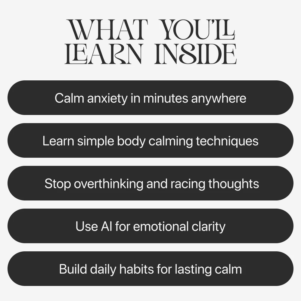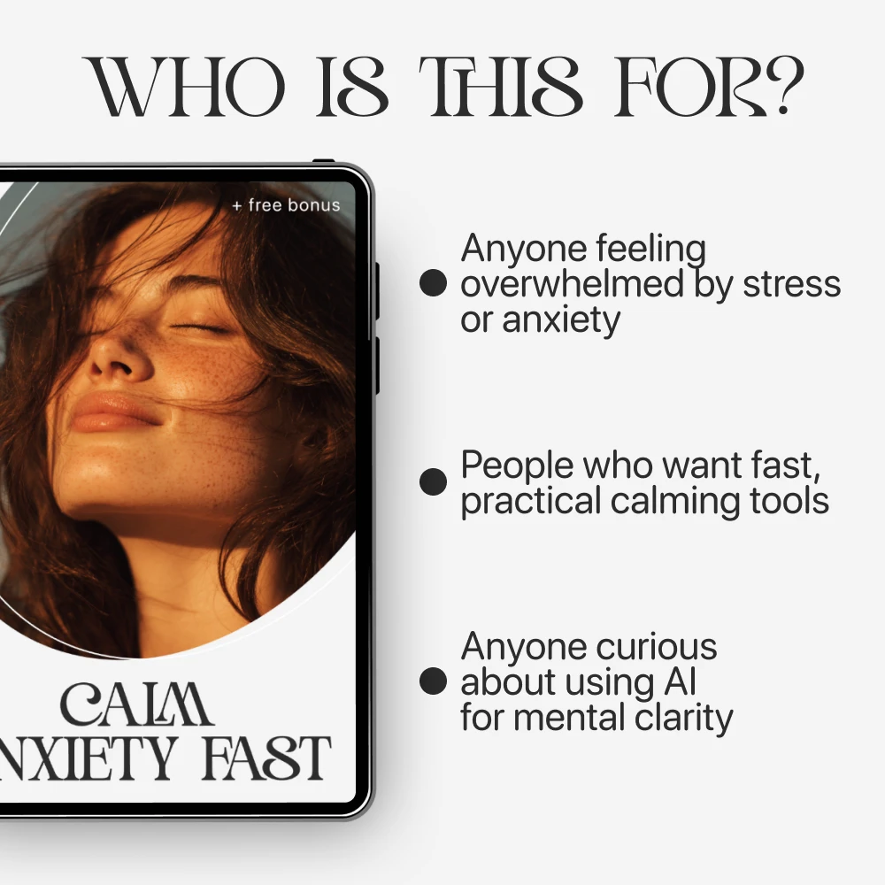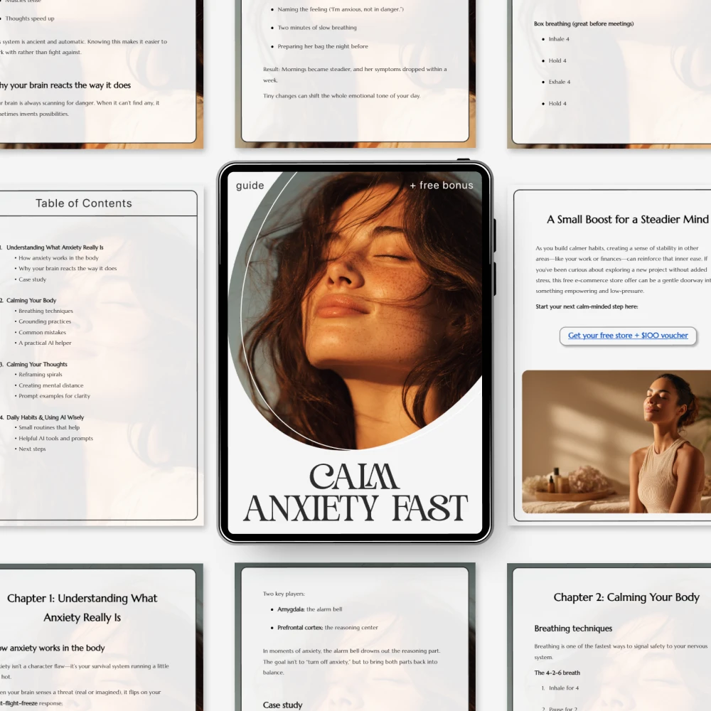Unlike generic anxiety guides, this one combines psychology, body-based techniques, and AI-powered tools into one clear system. You don’t just read about how to calm anxiety, you practice it with guided prompts, real exercises, and practical routines you can use immediately. No fluff. No confusing jargon. Just tools that work in the real world.