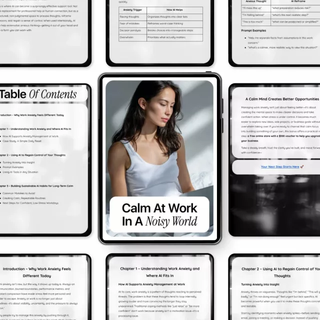 Modern work is louder, faster, and more demanding than ever. Notifications never stop, expectations keep rising, and anxiety often shows up quietly in the background of your day. Calm at Work in a Noisy World is a practical, easy-to-follow digital guide designed to help you feel grounded, clear-headed, and in control again. This guide shows you how to use ai to manage work anxiety in a realistic way, without adding more pressure or complexity to your routine.