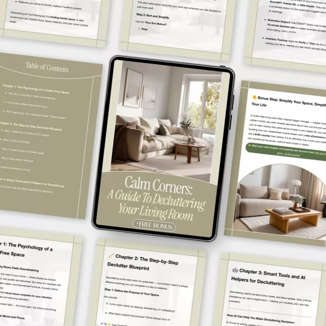 Start your journey to a calmer, clutter-free home today. Download Calm Corners: A Guide to Decluttering Your Living Room and discover the best way to declutter living room spaces—mindfully, beautifully, and effectively.