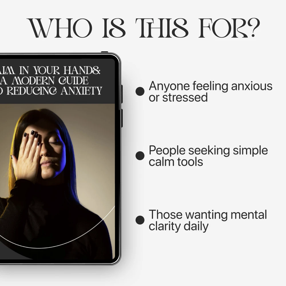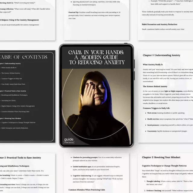 Unlike generic anxiety guides, Calm in Your Hands blends psychology, mindfulness, and modern digital tools to meet you where you are. It’s approachable, actionable, and designed for today’s busy minds — so you can start feeling better right now, not “someday.”