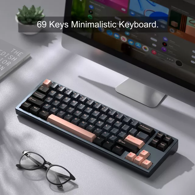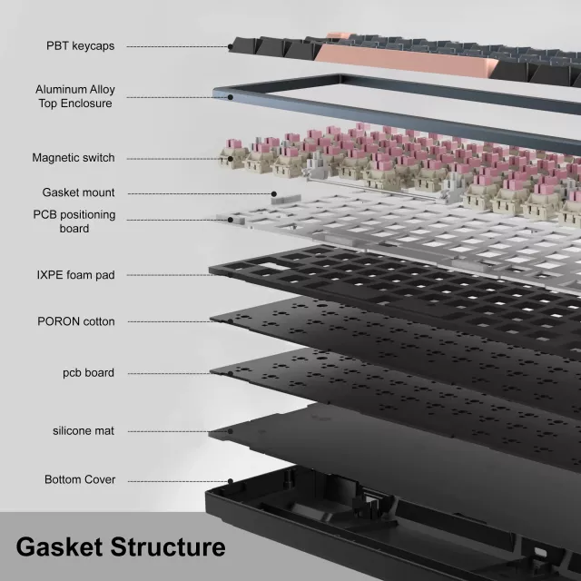 This 65% compact layout with 68 keys blends sleek style with practical function. Built with a CNC aluminum case for durability and double-shot PBT keycaps for long-lasting clarity, it’s crafted to handle heavy daily use. A gasket-mounted structure with multiple sound-dampening layers keeps every press soft, balanced, and quiet, while south-facing RGB backlighting lets you personalize your setup with vibrant lighting modes that shine brilliantly even in low-light conditions.