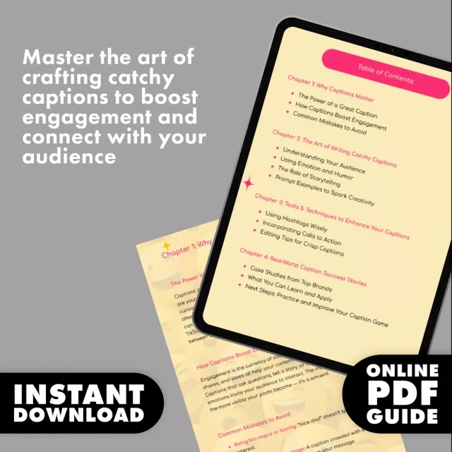 Unlock the power of words and take your social media game to the next level with Caption Magic: Crafting Catchy Lines That Click. This easy-to-follow guide is designed to help you write captivating captions that grab attention and spark engagement. Whether you’re an aspiring influencer, small business owner, or content creator, mastering the art of writing catchy captions can make all the difference in how your audience connects with your brand. With expert tips, actionable advice, and real-world examples, this digital download will have you crafting irresistible captions in no time!