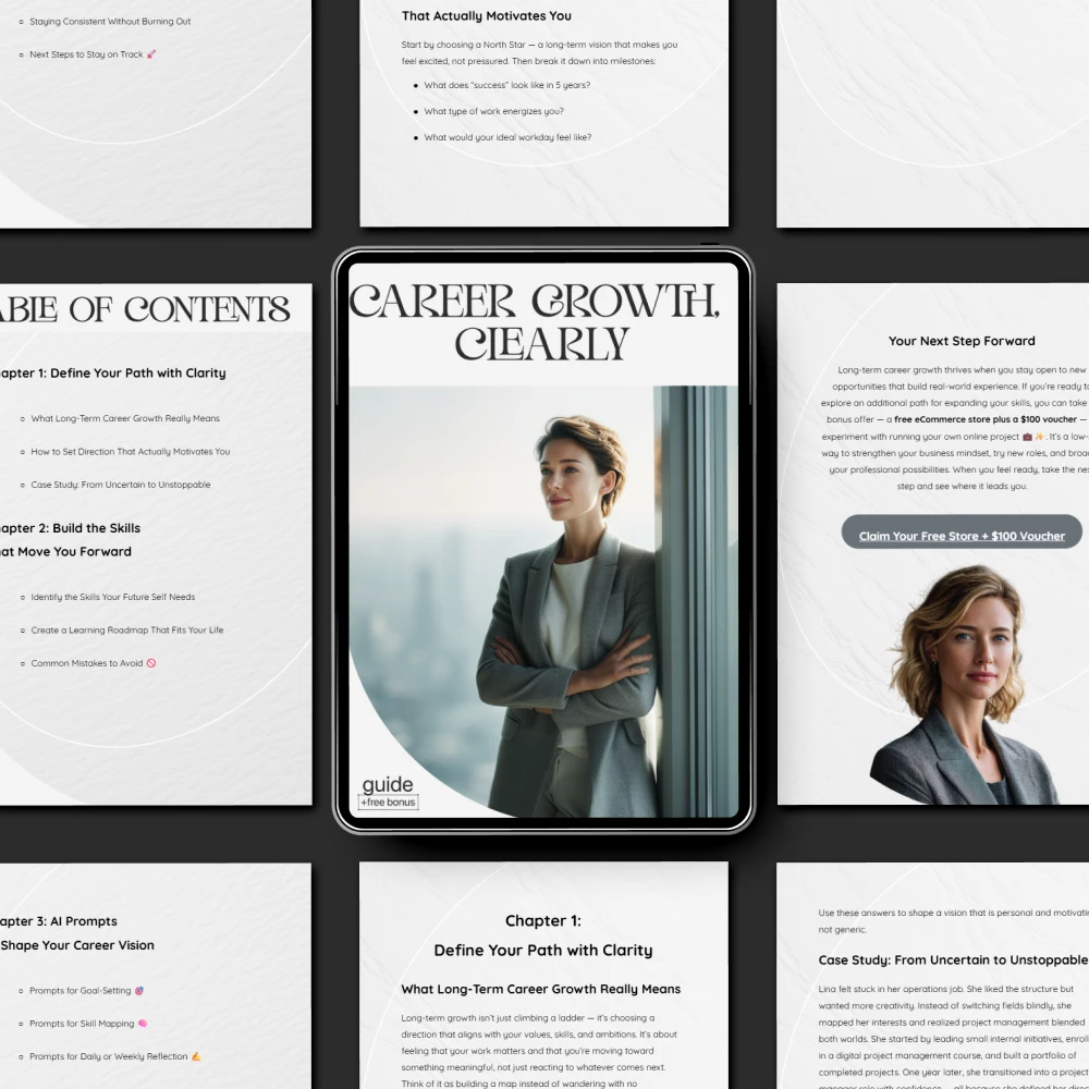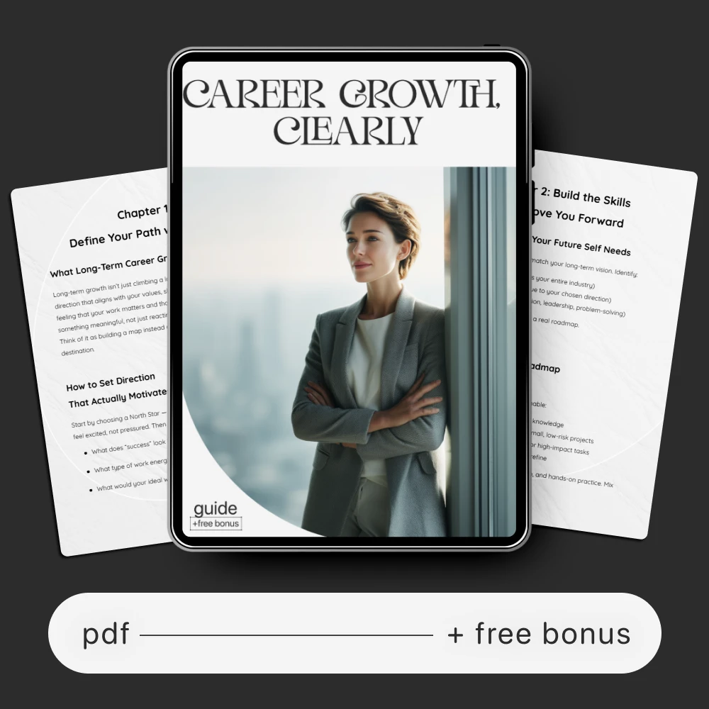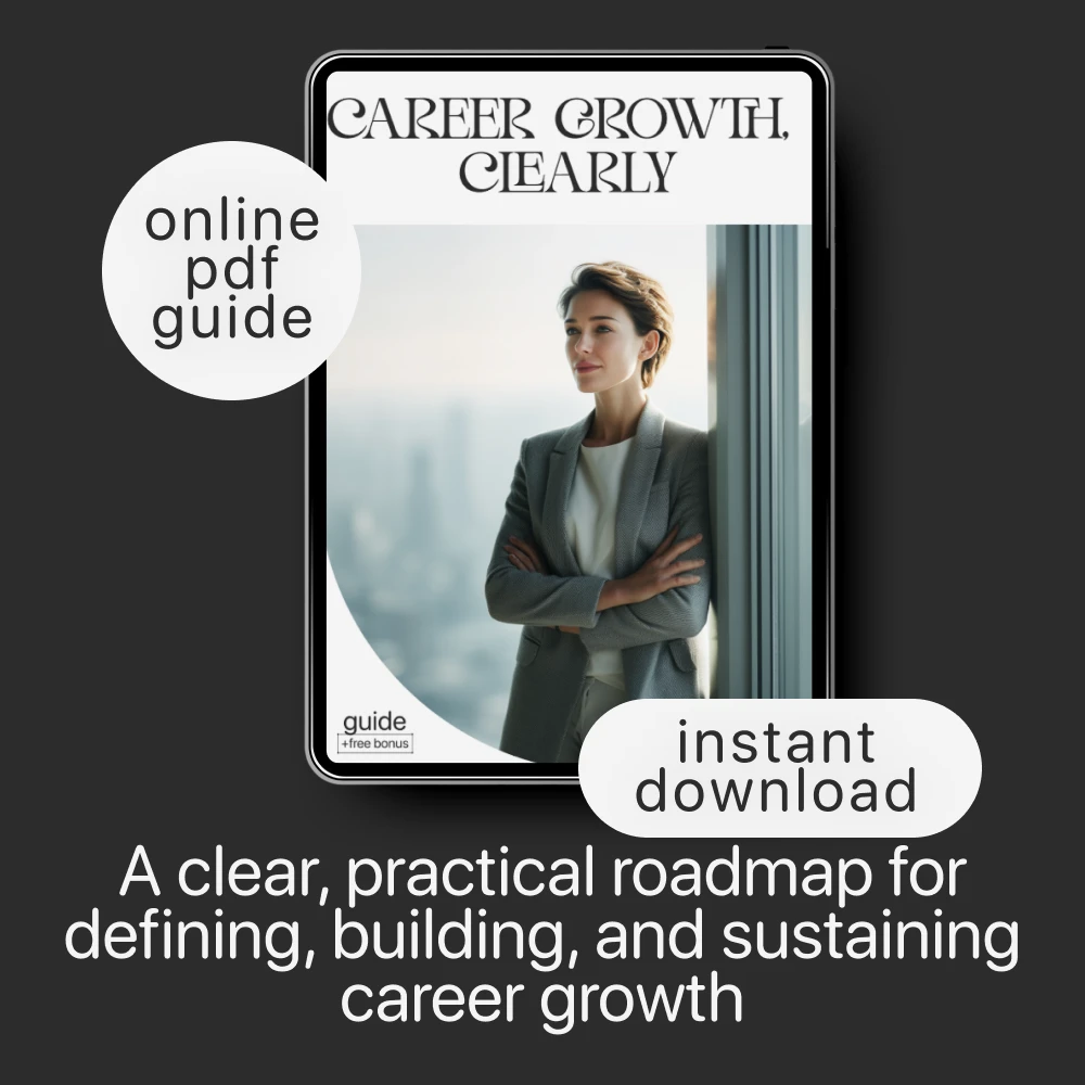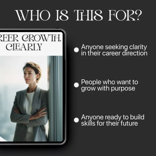 If you’re ready to finally get unstuck and confidently move toward the career you want, Career Growth, Clearly is your essential step-by-step digital guide. Designed for ambitious professionals who crave direction, clarity, and momentum, this downloadable resource helps you map out your long-term vision, build the skills your future self needs, and stay focused with practical tools you can use every day. Whether you’re navigating your next move, planning a reinvention, or simply trying to grow with purpose, this guide gives you the clarity and structure you’ve been missing.