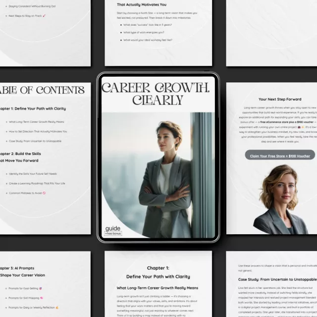 Career Growth, Clearly stands out because it combines clear strategy, practical exercises, and AI-powered prompts that help you think deeper and act smarter. Instead of overwhelming you with generic advice, it offers a simple, actionable roadmap you can personalize—no guesswork, no confusion, just clarity.