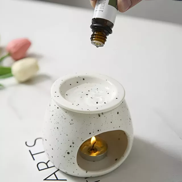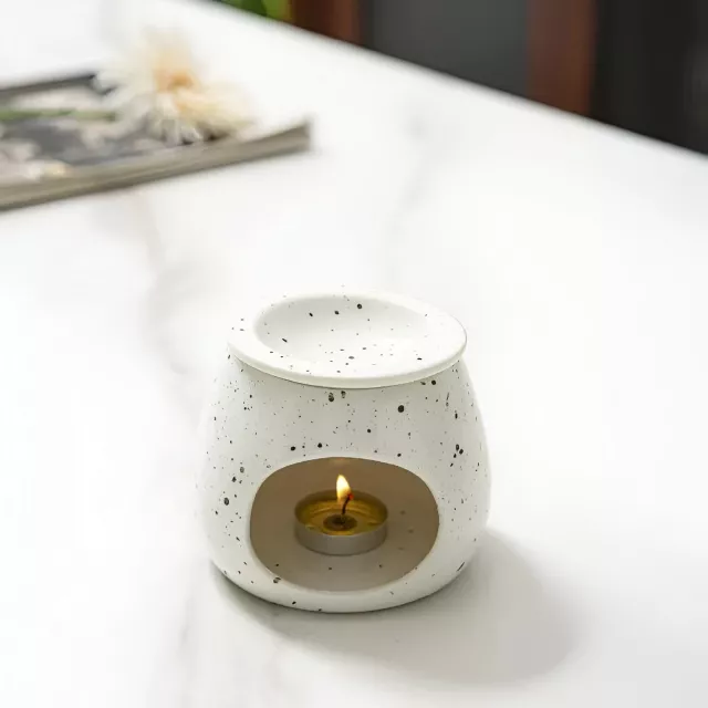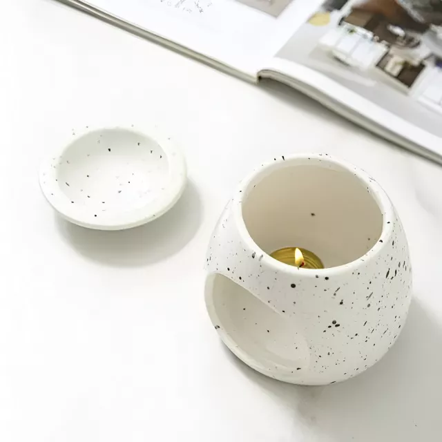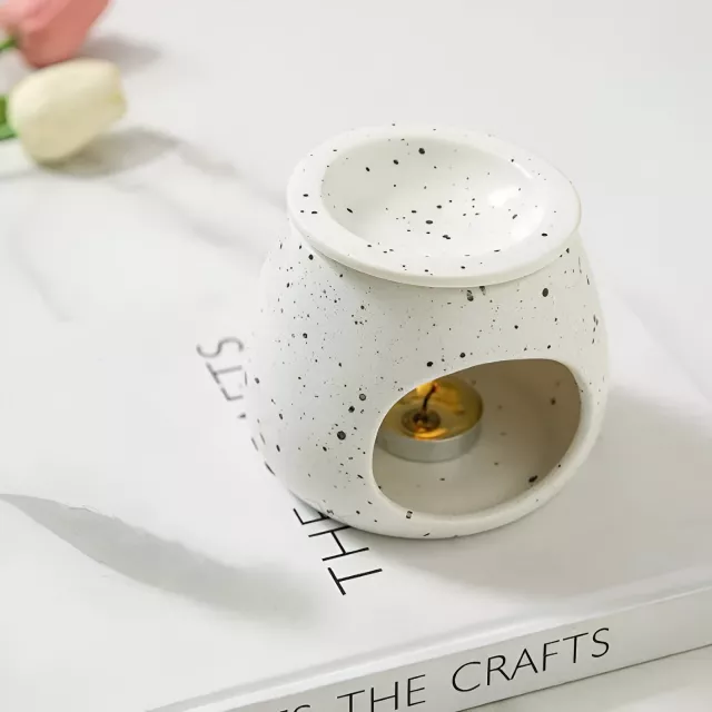 Transform any room into a tranquil retreat with this beautifully crafted ceramic aroma burner. Featuring a stylish white spotted glaze, this elegant burner doubles as a candle holder and essential oil diffuser, perfect for adding a warm, inviting fragrance to your home. Its sleek design complements any decor, making it an ideal centerpiece for your living room, yoga space, or special occasions like engagements.