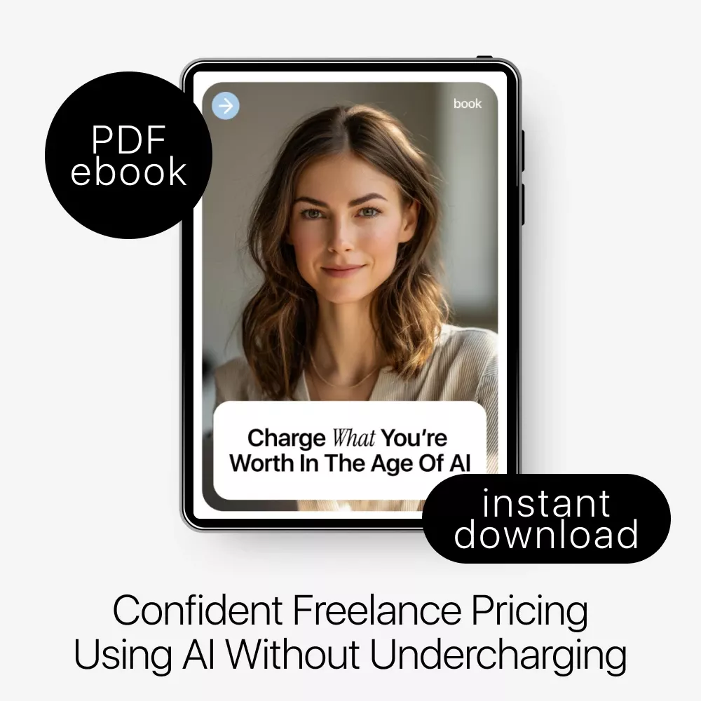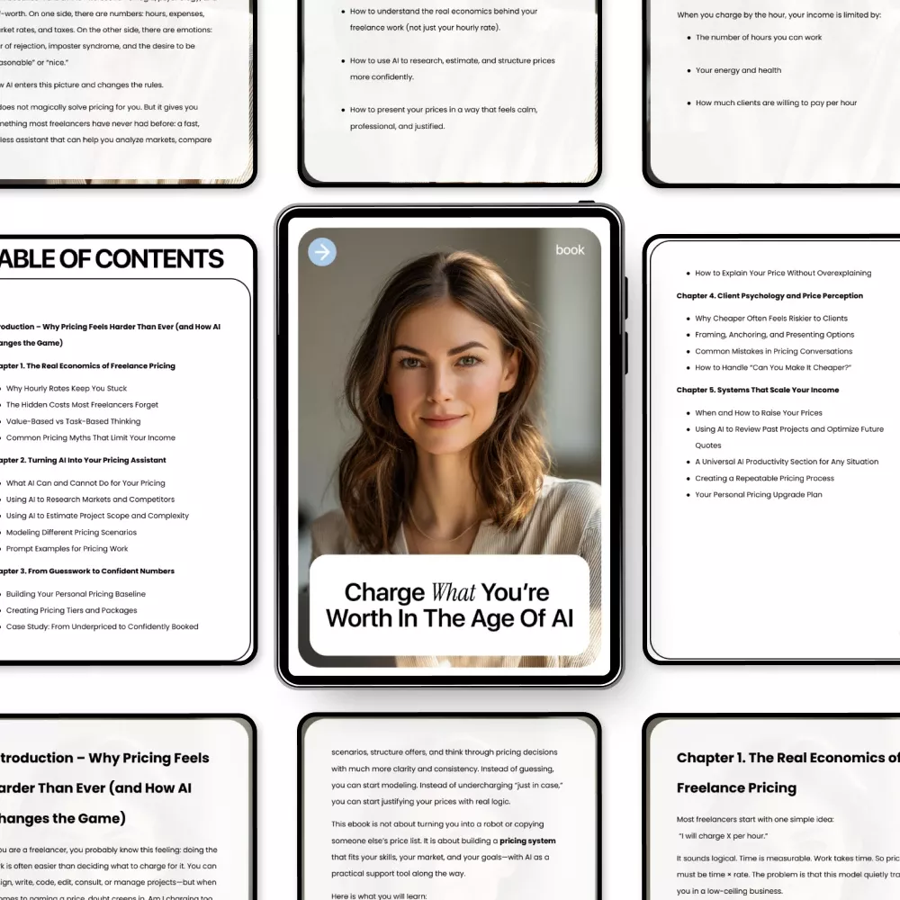 Pricing your freelance work shouldn’t feel like a constant guessing game. Charge What You’re Worth in the Age of AI is a practical, easy-to-follow eBook designed to help freelancers set confident prices—even as AI reshapes how work is valued. Instead of racing to the bottom or copying what others charge, this guide shows you how to combine real economics, client psychology, and AI tools to price your services with clarity and confidence.