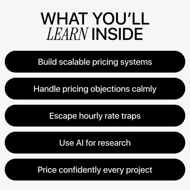 Most pricing resources focus on theory or outdated advice. This guide is built specifically for the AI era. It shows you what AI can and cannot do, how to use it responsibly, and how to keep your human value front and center. You’ll move from guesswork to systems—so pricing becomes repeatable, scalable, and far less emotional.