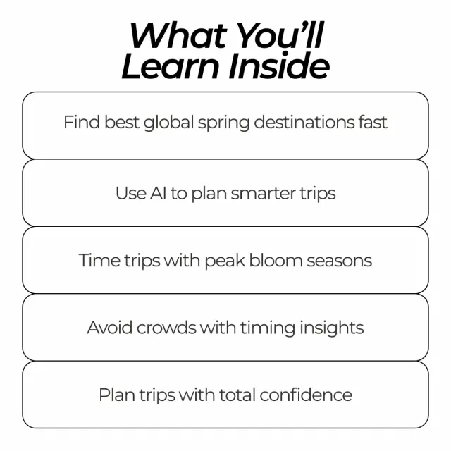 Unlike generic travel lists, this bundle combines seasonal destination strategy, cultural timing insights, and modern AI planning methods in one place. You are not just getting destination ideas. You are getting a complete system for deciding where to go in spring based on timing, trends, and personal travel goals.
