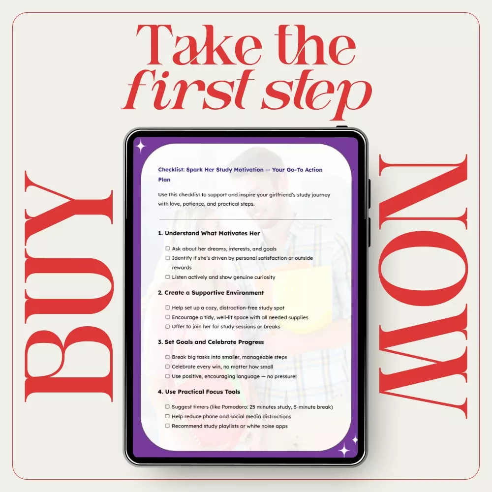 Our step-by-step guide helps you understand how to motivate your girlfriend to study by tailoring support to her unique personality and preferences. Whether she’s motivated by personal satisfaction or external rewards, this checklist will give you the tools to encourage her in a way that feels empowering, not pushy. Ready to spark her study motivation? This guide is your go-to action plan!