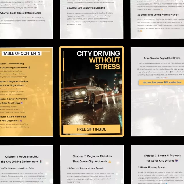 Unlike typical driving manuals, City Driving Without Stress focuses on how city driving really feels. It teaches awareness, anticipation, and calm decision-making—not just rules. The AI prompt approach and mindset-based strategies help you practice smarter, not harder.