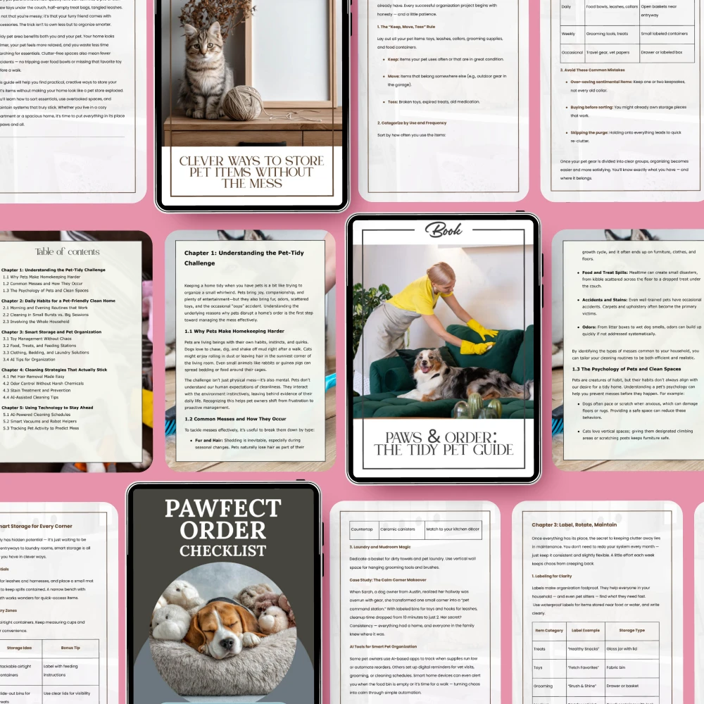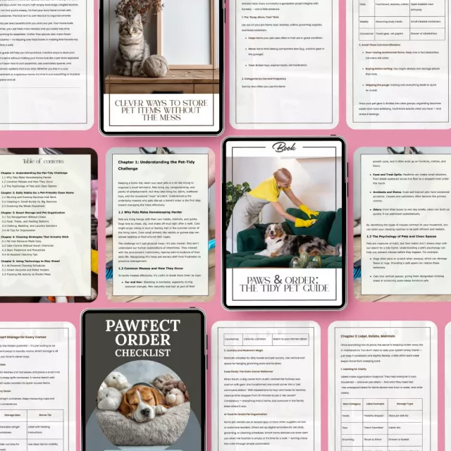 As a pet owner, I've always struggled with keeping my home tidy. The clutter and mess that comes with pets can be overwhelming at times. But this bundle has been a lifesaver! It's packed full of practical advice that's easy to implement. The guide on clever ways to store pet items is particularly helpful, it’s filled with creative ideas for organizing all the essentials.