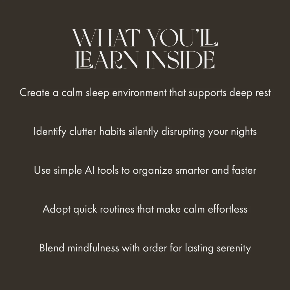 • Chapter 1: The Hidden Link Between Clutter and Sleep – Understand why your environment shapes your rest, with scientific insights and a real-life transformation story.