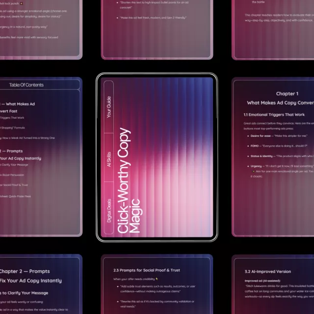 Click-Worthy Copy Magic is your ultimate digital guide to writing ads that attract attention, spark emotion, and drive action. Inside, you’ll learn ai prompts for ad copy improvement that instantly sharpen your messaging and make your campaigns stand out. Whether you’re a small business owner, marketer, or creative entrepreneur, this guide teaches you how to take average copy and turn it into scroll-stopping content that sells — with the help of AI. You don’t need to be a copywriting expert; just bring your ideas, and this guide will help you refine them into powerful, click-worthy messages.