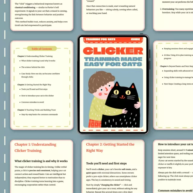 • Chapter 1: Understanding Clicker Training – Learn what clicker training is, how it works, and explore a real-life case study of a shy cat who gained confidence through clicks.