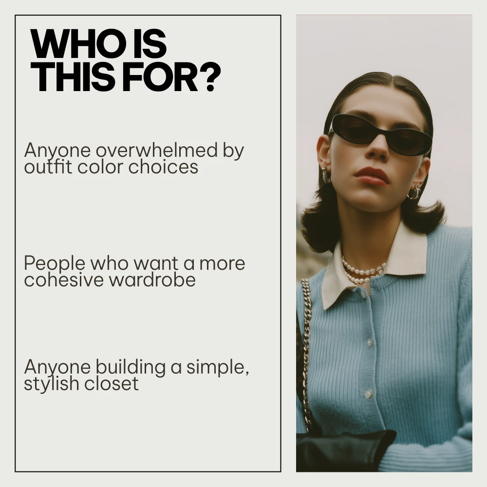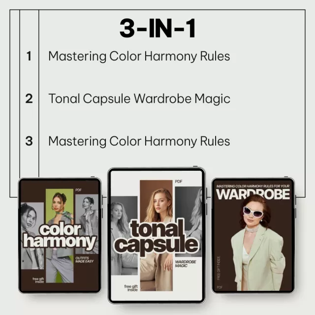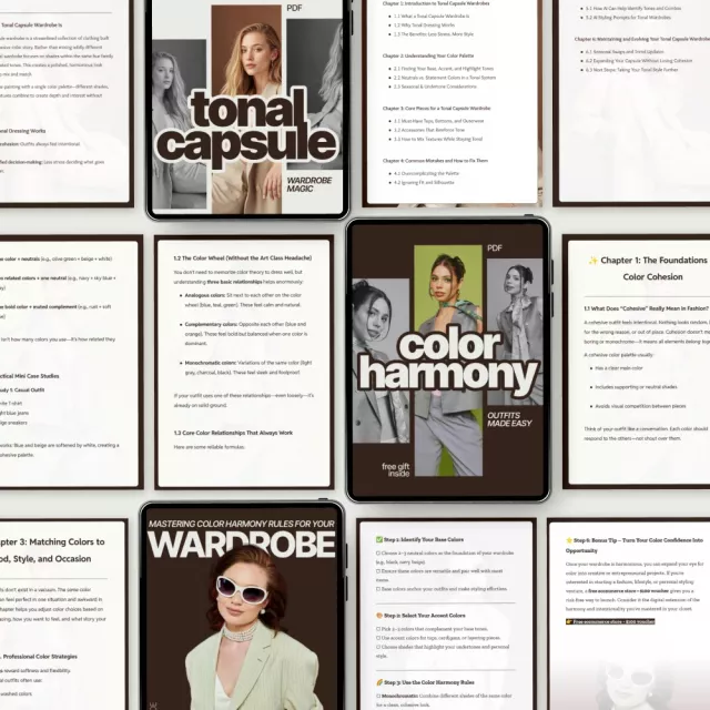 This 3-in-1 digital guide has completely transformed how I see my closet! No longer do I stand there clueless about what to wear; instead, thanks to these guides' clear explanations of color harmony rules, choosing outfits has become second nature. Also, the tonal capsule magic section? Pure genius! Makes dressing up fun again while making sure everything looks put-together and stylish 💫