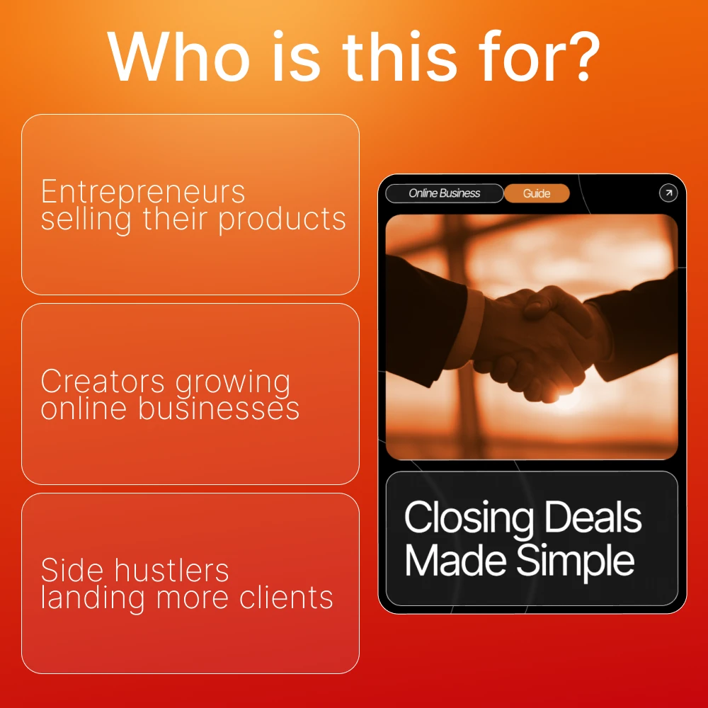 This guide is perfect for creators, small business owners, and side hustlers ready to feel more confident selling their products or services. If you want sales steps explained simply and strategies that actually work, Closing Deals Made Simple gives you the clarity and tools to close with ease — no pushy tactics required.