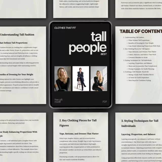 This guide is for tall women and men who want practical fashion guidance without confusing jargon. It stands out by combining real-world styling advice with modern planning tools, clear examples, and a focus on confidence—not trends alone. Instead of generic fashion rules, you get height-specific insights that actually work for tall bodies.