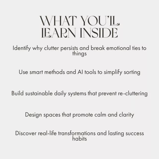 • Chapter 4: Living Clutter-Free Forever — Redefine minimalism, design joyful spaces, and build a lifestyle that naturally supports clutter-free living.