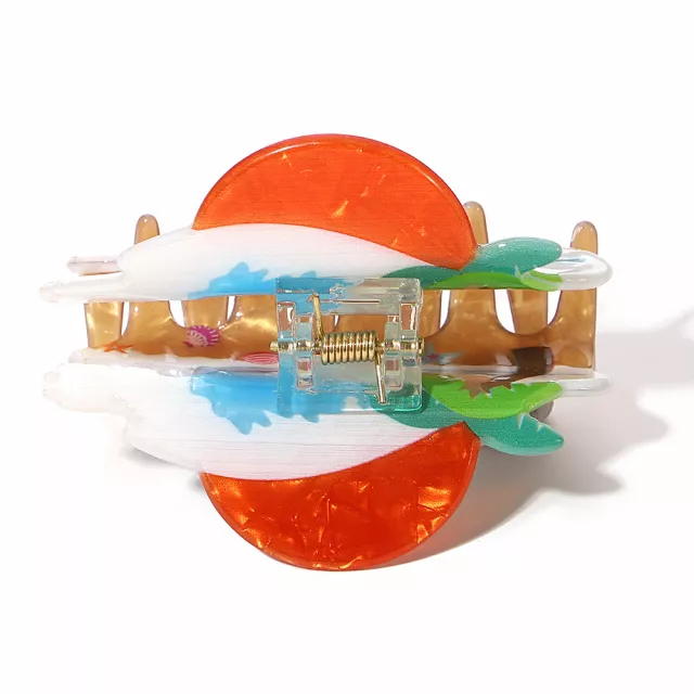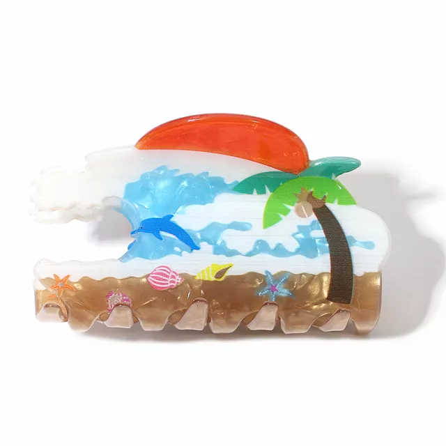 This hair clip is special because it transforms tropical daydreams into wearable art. The detailed scenery design features a complete beach landscape with swaying coconut trees, cheerful sun, and gentle ocean waves—all captured in bright, joyful colors. What makes it truly special is the original artistic design that goes beyond simple patterns to create a miniature masterpiece for your hair. The high-quality acrylic maintains its vibrant colors through sun exposure and summer activities, while the strong claw mechanism keeps your style secure. It’s this combination of artistic creativity, quality materials, and playful functionality that makes it exceptional.