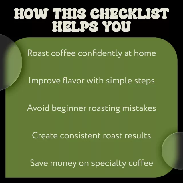 This checklist is ideal for beginners who want hands-on coffee roasting ideas without complicated jargon. It is perfect for home coffee lovers, hobbyists, and anyone curious about turning green beans into a flavorful cup with confidence.