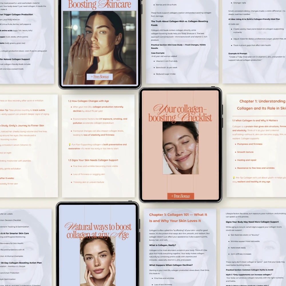 Glow smarter, not harder. The Collagen Boosting Tips Bundle is a thoughtfully designed 4-in-1 digital download created to help you support healthy, radiant skin from the inside out. If you’ve been searching for clear, realistic collagen boosting tips that actually fit into real life, this bundle brings everything together in one easy, actionable place. No fluff, no overwhelm—just practical guidance you can start using today.