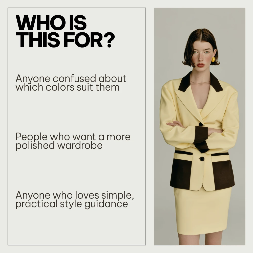 This bundle is perfect for anyone who loves fashion but wants clarity—busy professionals, style beginners, capsule wardrobe fans, or anyone tired of clothes that look great on the rack but not on them.