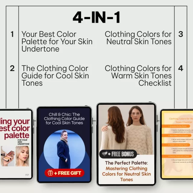 Wow, what a revelation this 4-in-1 digital bundle has been! I've always struggled with finding the right colors to match my skin tone. It was like wading through a sea of confusion and uncertainty every time I went shopping. But now, thanks to this amazing guide, choosing the right clothing colors feels empowering instead of confusing. Not only does it help you understand which shades make your skin glow but it also shows how to dress with confidence using natural coloring as the guide.
