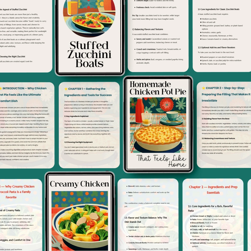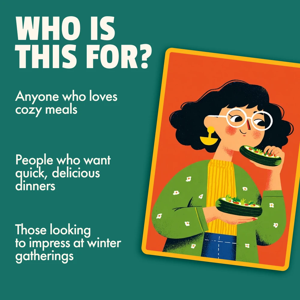 • Variety and creativity: Enjoy a range of comforting dishes like creamy pasta, stuffed zucchini, and cozy desserts, keeping your weeknights exciting.