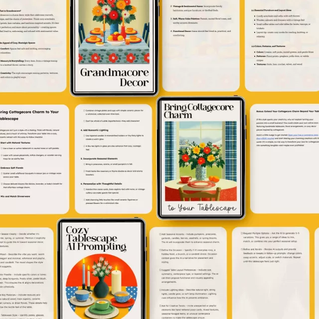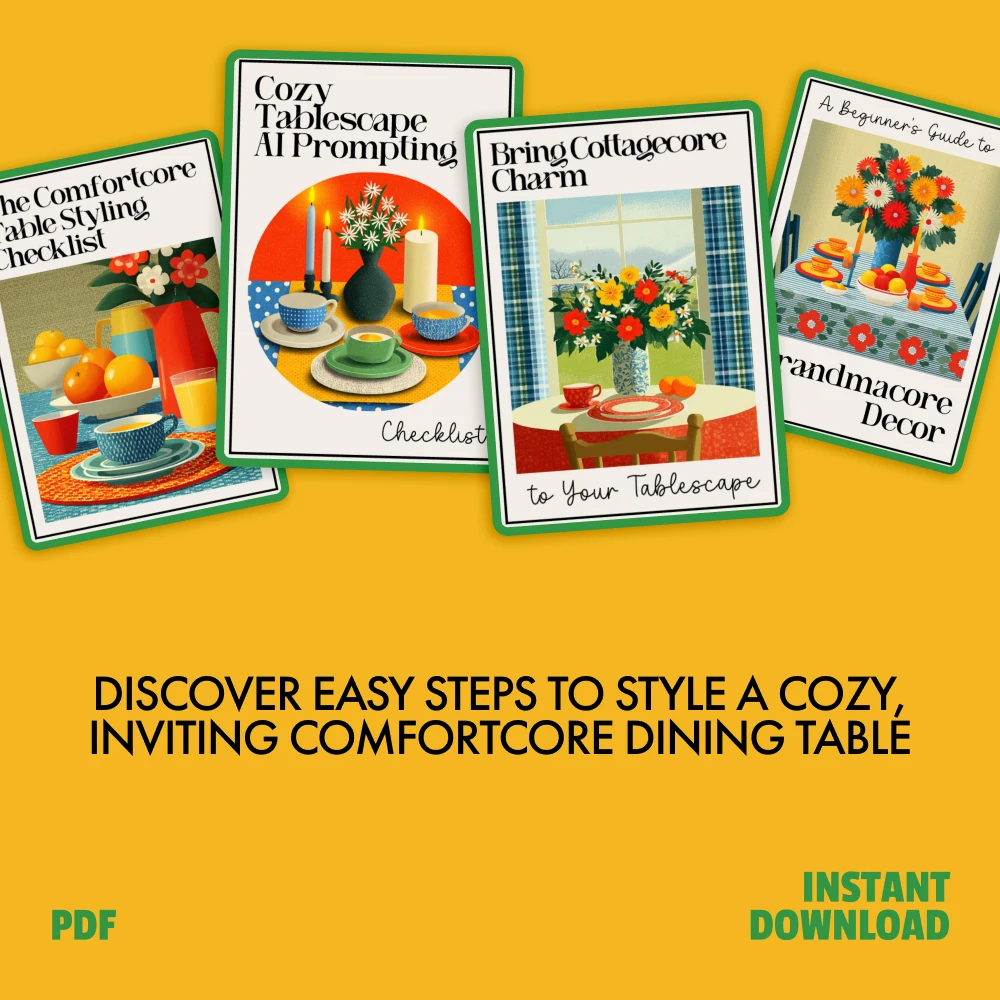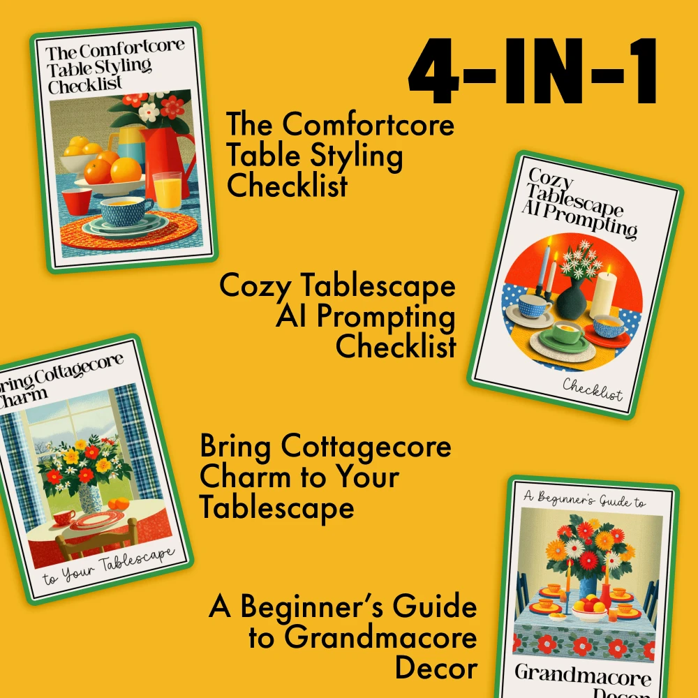 Unlike other general styling guides, the Comfortcore Styling Toolkit is specifically tailored to the unique comfortcore, cottagecore, and grandmacore trends. Each component offers step-by-step instructions and practical ideas that make styling your dining table feel effortless. Plus, the Cozy Tablescape AI Prompting Checklist takes your creativity to the next level, making it easier than ever to build a beautiful, cozy space.