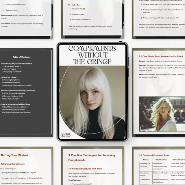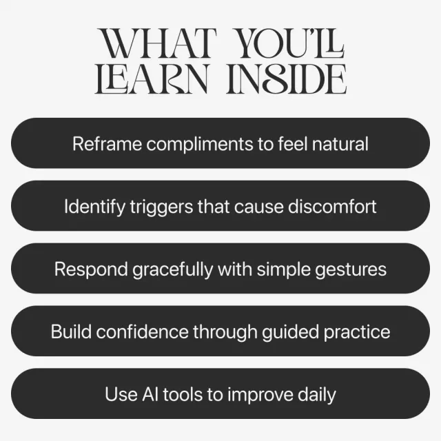 • Practical Techniques for Receiving Compliments: Get actionable scripts, gestures, and role-playing prompts to make your responses feel natural.