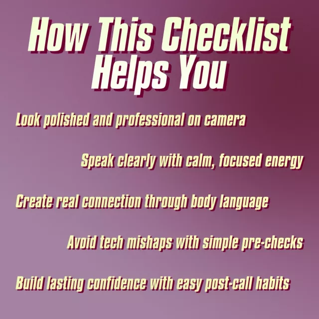 Not just a reminder to “sit up straight”—this is your new pre-call ritual. With clear steps for before, during, and after your calls, this tool helps you build lasting habits that elevate your online presence and boost your confidence, one click at a time.