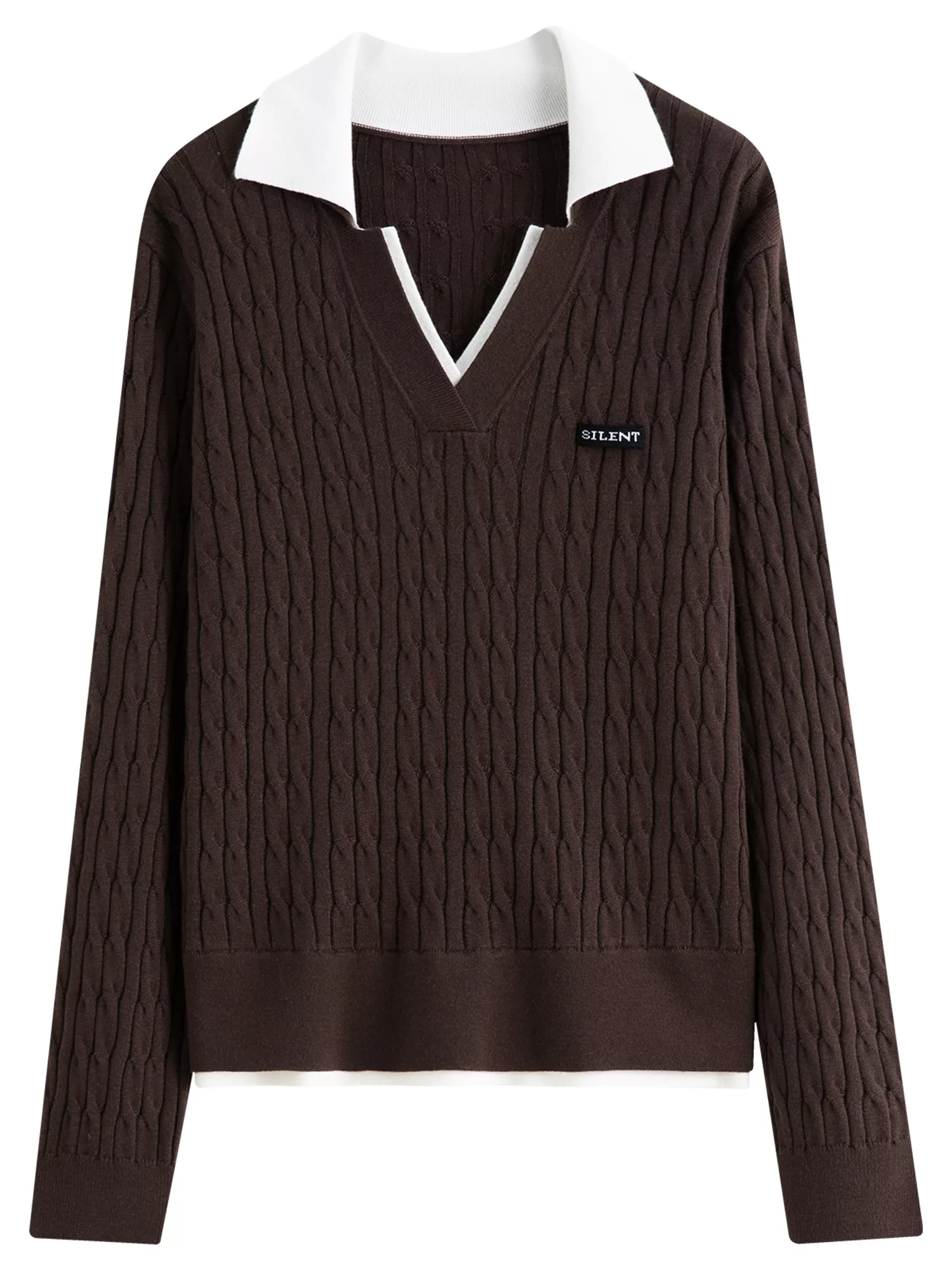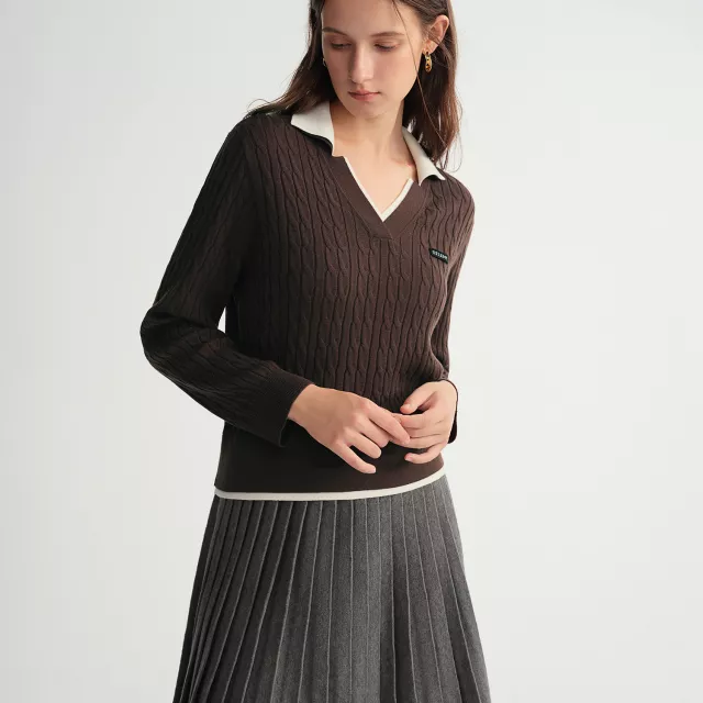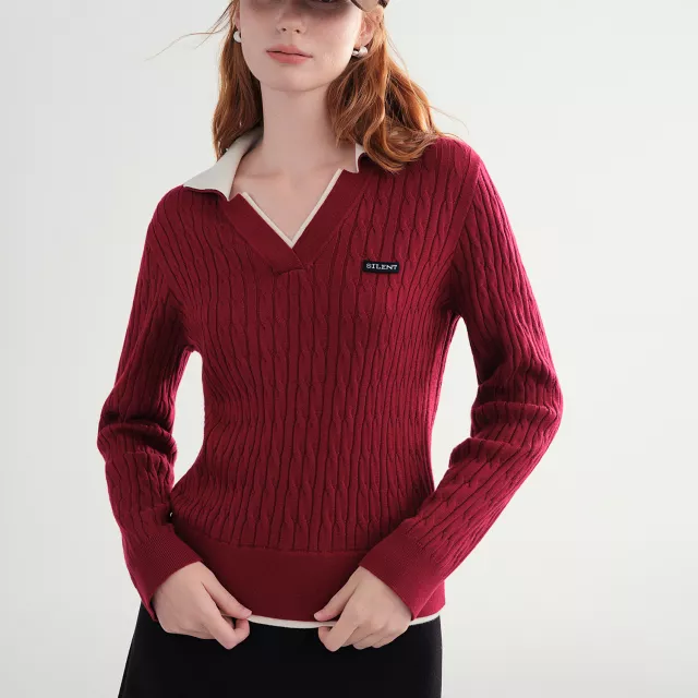 Contrast V-Neck Cable Knit Sweater for Women