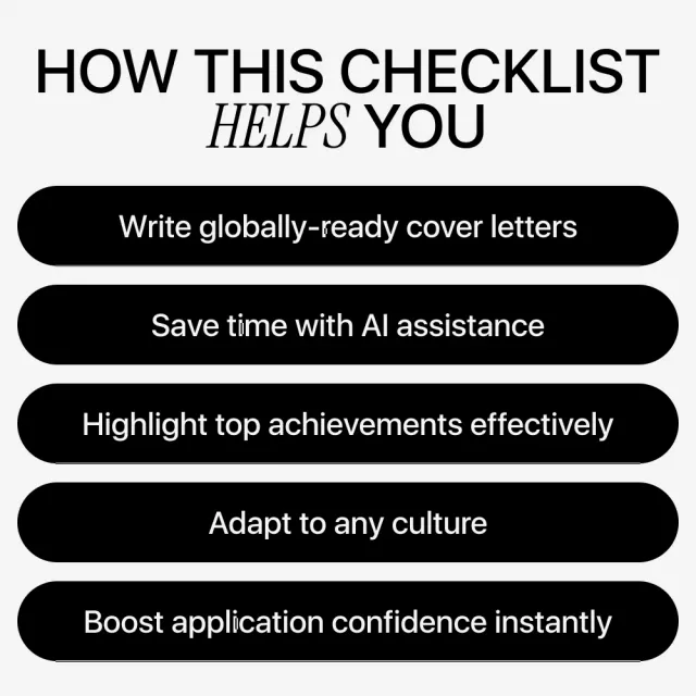 This checklist is perfect for job seekers aiming for international opportunities who want to combine professional guidance with cutting-edge AI for writing a cover letter for an international job. It’s ideal for early-career professionals, experienced candidates, and anyone looking to make a global impression with a standout cover letter.