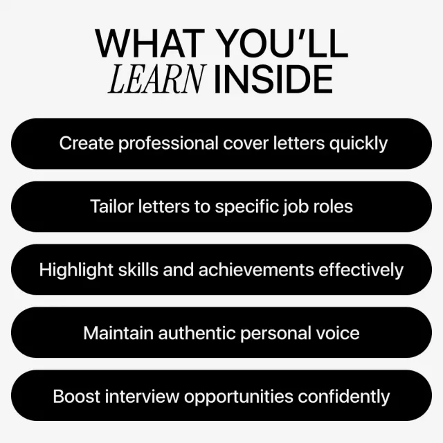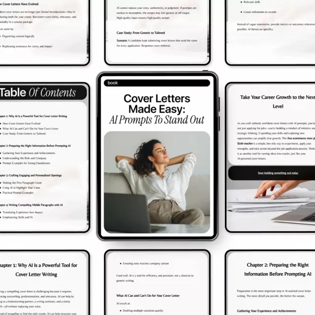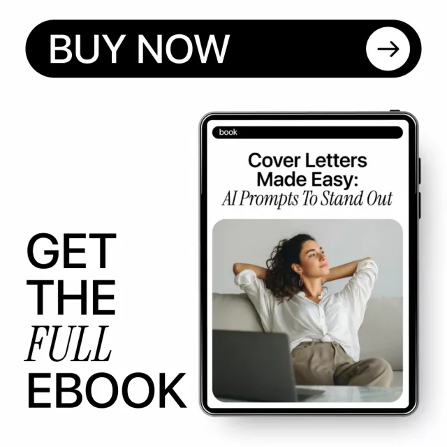 This eBook is perfect for job seekers at any stage of their career—students, career changers, and experienced professionals alike. If you want to leverage AI to create personalized, compelling cover letters that stand out from the competition, this guide is for you.